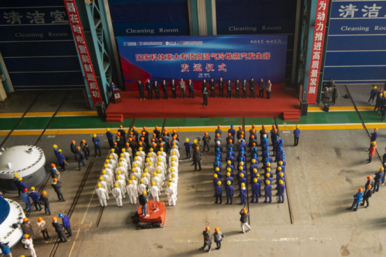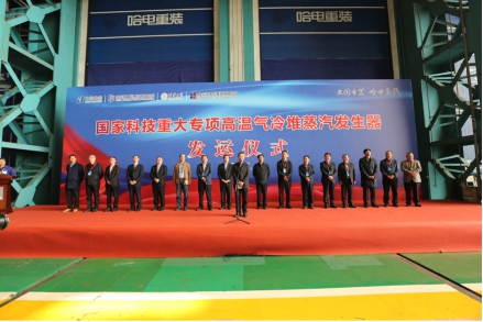 驗收會后,哈電集團黨委書記、董事長斯?jié)煞蚺c中國華能黨組成員、副總經理葉向東共同為“大國重器”揭幕,各方代表分別致辭,對國家科技重大專項全球首臺高溫氣冷堆蒸汽發(fā)生器研制成功并順利通過驗收表示祝賀。